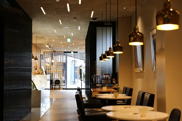 外の明るさとの対比で、店内の落ち着いた雰囲気が印象的になりました。