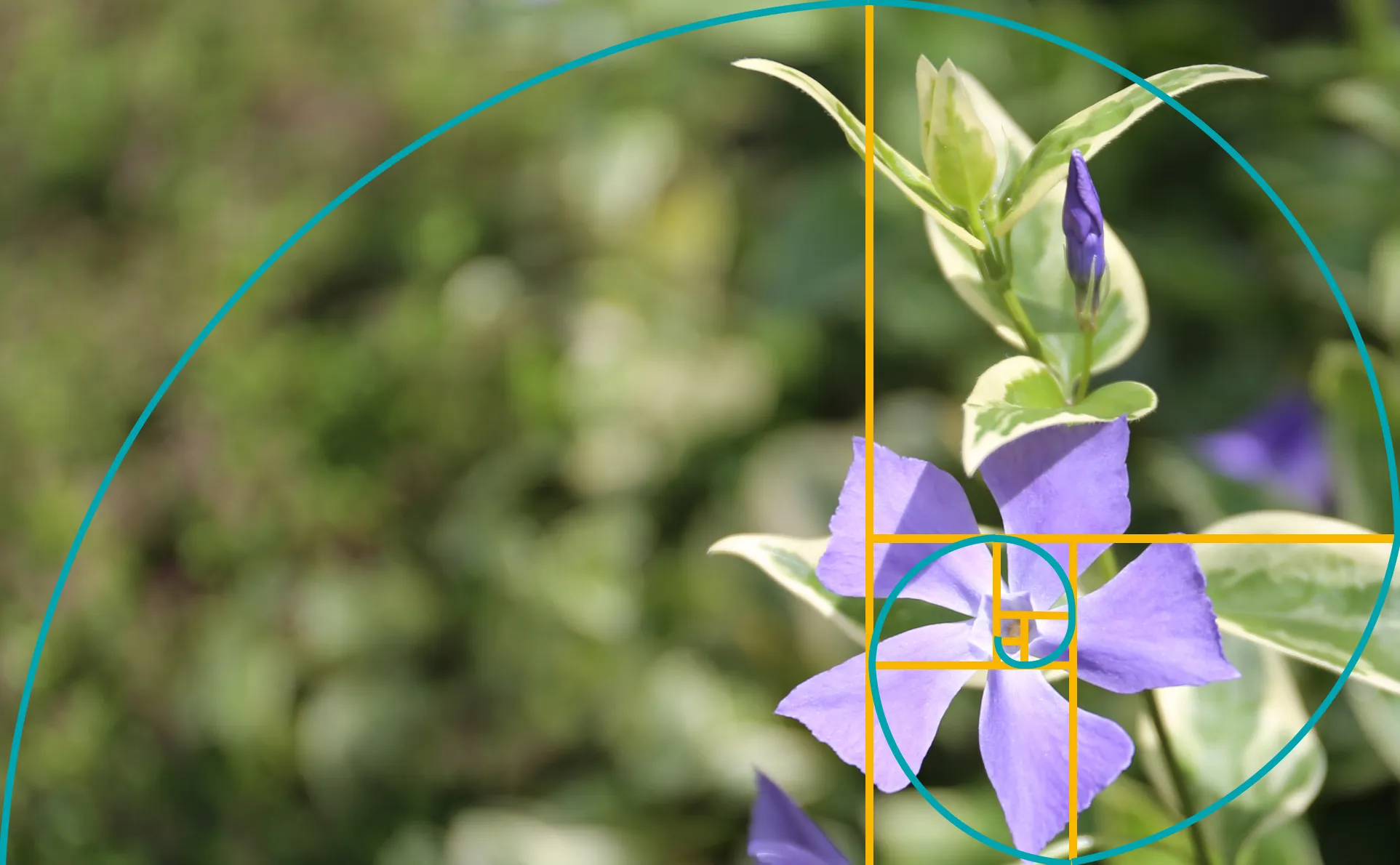 フィボナッチ数列「1, 1, 2, 3, 5, 8, 13, 21…」(前の数字を足した数字が続く)に基づいて螺旋を描き、その螺旋の中心に最も注目して欲しいものを配置します。