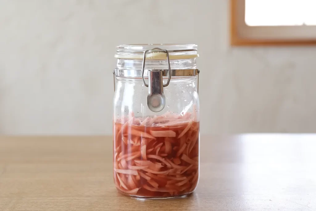 - 赤梅酢をひたひたになるまで加える