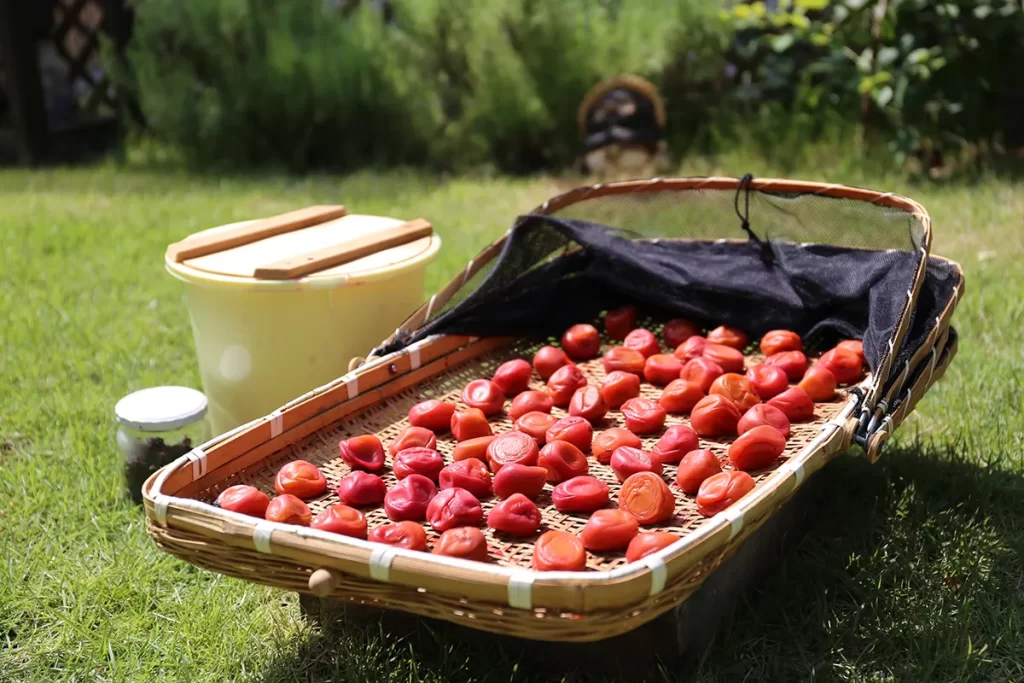 - 日に当てて乾いたら梅干しの完成。